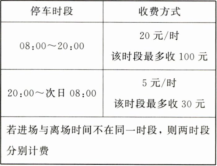 9. (3分)某停车场$24\mathrm{h}$营业,其收费方式如表所示,已知小聪爸爸某日10:00进场停车,停了$x\mathrm{h}$后离场,$x$为整数.若小聪爸爸离场时间介于当日的20:00~24:00之间,则他此次停车的费用为