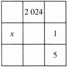5. (3 分)我国古代的“九宫图”是由 $3 × 3$ 的方格构成的, 每个方格均有不同的数, 每行、每列、每条对角线上的三个数之和相等.如图给出了“九宫图”的一部分, 请推算 $x$ 的值是 (