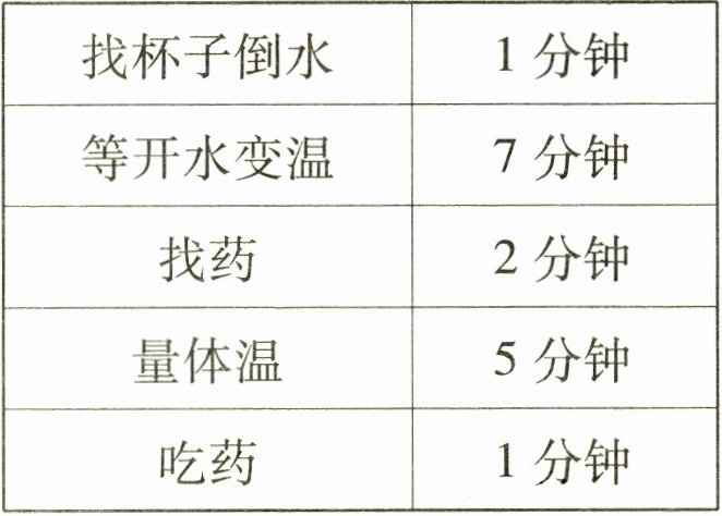 找杯子倒水1分钟→等开水变温、找药、量体温7分钟→吃药1分钟 1+7+1=9(分钟)
