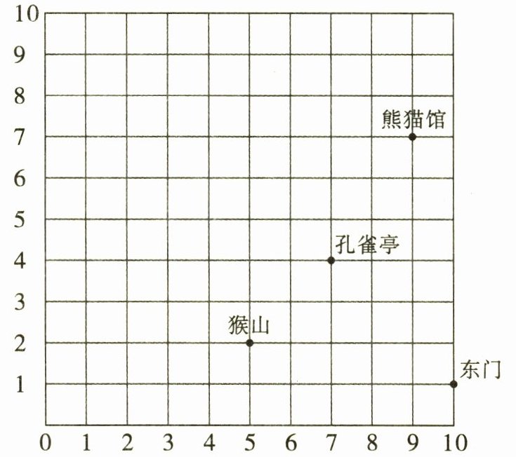(1)猴山的位置用$(5,2)$表示,请你在图上标出金鱼湖$(6,6)$、盆景园$(3,8)$、北门$(2,10)$的位置。