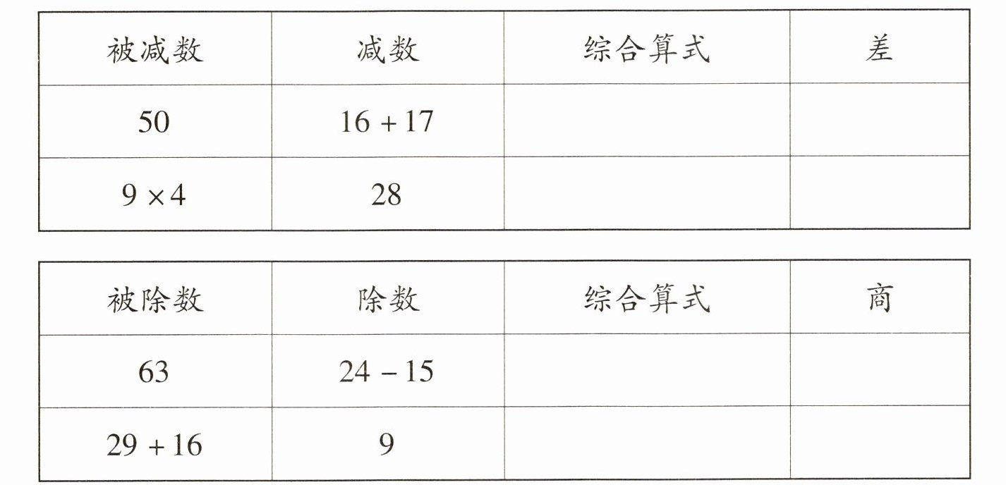 50-(16+17) 17 9×4-28 8 63÷(24-15) 7 (29+16)÷9 5