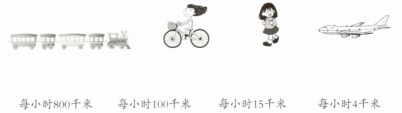 火车连每小时100千米,自行车连每小时15千米,步行连每小时4千米,飞机连每小时800千米。