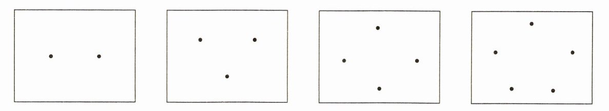 2. 连接下面每幅图中的任意两点画线段,最多能画几条?画一画,数一数,填一填。