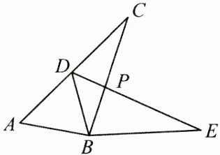 9. (8分)如图, $ \triangle ABC \cong \triangle DBE $,点D在边AC上,BC与DE相交于点P,已知 $ \angle ABE = 162° $,$ \angle DBC = 30° $,$ \angle C = 27° $,求 $ \angle BDE $ 的度数.