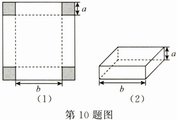 10.(3分)如图(1),将一张长方形纸板四角各切去一个同样的正方形,制成如图(2)的无盖纸盒,若该纸盒的容积为$4a^{2}b$,则图(2)中纸盒底部长方形的周长为 (