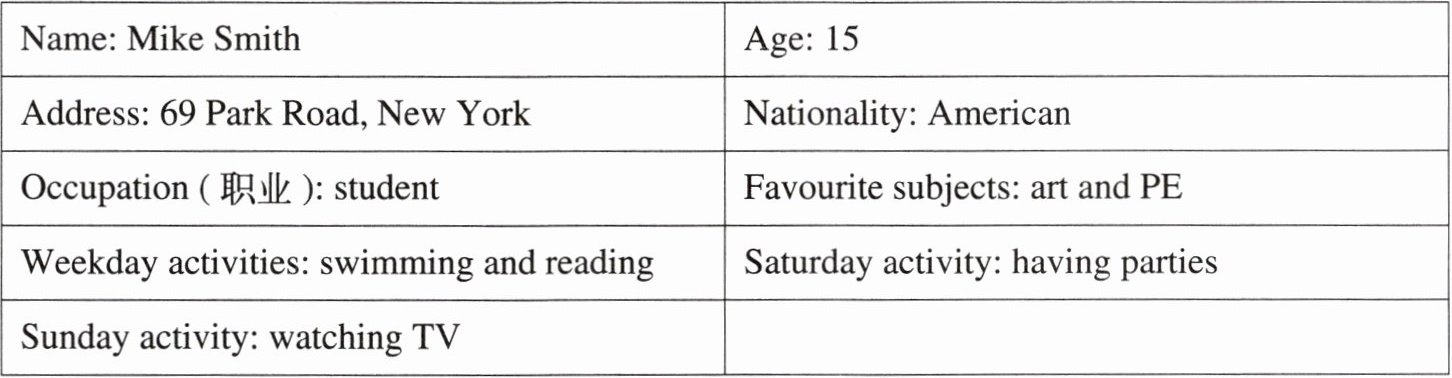 Mike Smith is an American student. He is 15 years old. He lives at 69 Park Road, New York. His favourite subjects are art and PE. On weekdays, he often goes swimming and does some reading. On Saturday, he usually has parties. And on Sunday, he likes watching TV.