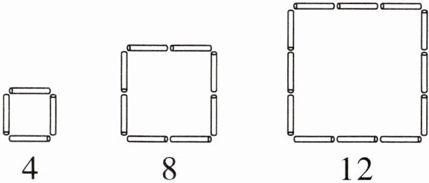 四、用小棒摆正方形,如图。照这样摆下去,第4个图形要用多少根小棒?第5个呢?