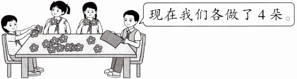 1. 每人还要做几朵花?4人一共还要做几朵花?