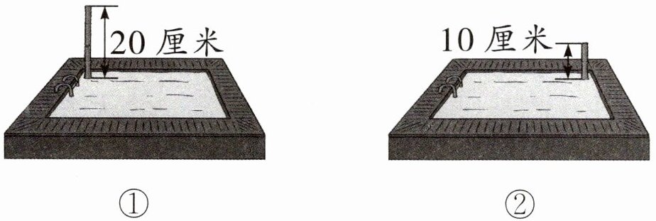 七、为了测量两个游泳池中水的深度,小欢用一根 $1$ 米长的竹竿分别竖直插至水池底部。( )号水池中的水更深,比另一水池中的水深( )厘米。