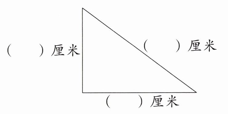 实际测量: 3厘米(两条直角边), 5厘米(斜边 )(实际斜边为直角三角形斜边,根据勾股定理计算$\sqrt{2^2+3^2}\approx 3.605$,测量值合理即可)。