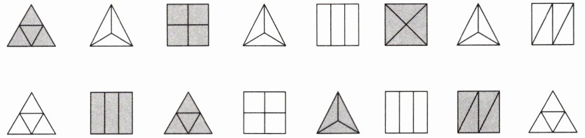 阴影图形:第三个,第六个,第九个(从左到右第一排);第十三个,第十六个(从左到右第二排)。