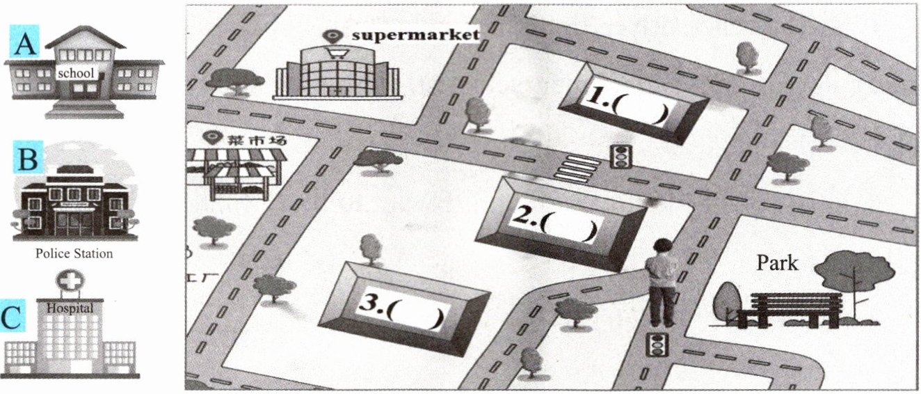 听录音,将不同地点的字母序号写在图中对应的括号内,并画出到 supermarket 的路线图。