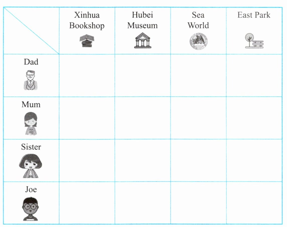 听录音,找出人物要去的地点,在对应的方框内画“√”,并在四线格内写出正确的单词,完成短文。