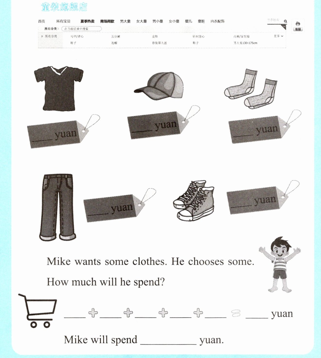 听录音,在横线上用阿拉伯数字写出商品的金额,然后进行加法计算。