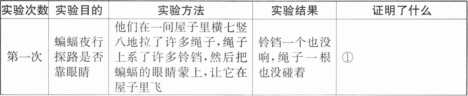 二、阅读第 4~7 自然段,为了弄清楚蝙蝠能在夜间飞行的原因,科学家们做了三次实验,每次实验的目的是什么? 用了什么方法? 结果怎样? 证明了什么?