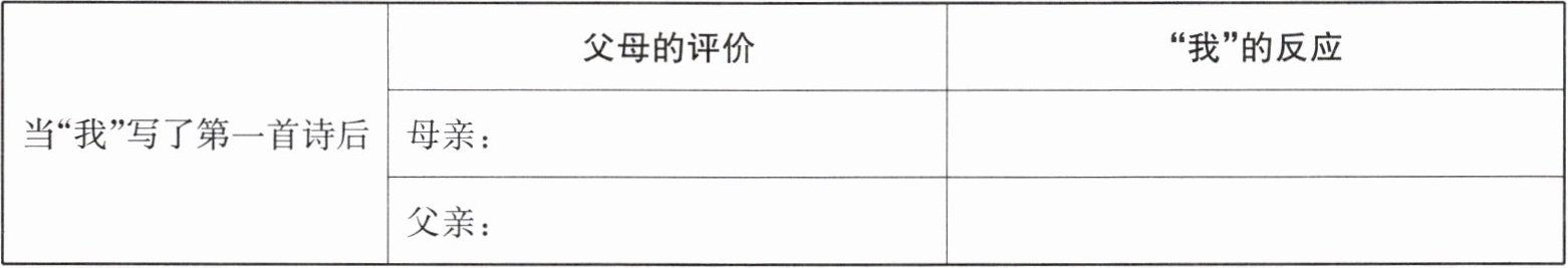 (2)母亲是为“我”能写诗这件事而高兴,借此机会鼓励“我”;而父亲注意的不是“我”写诗的行为而是诗本身的质量。
