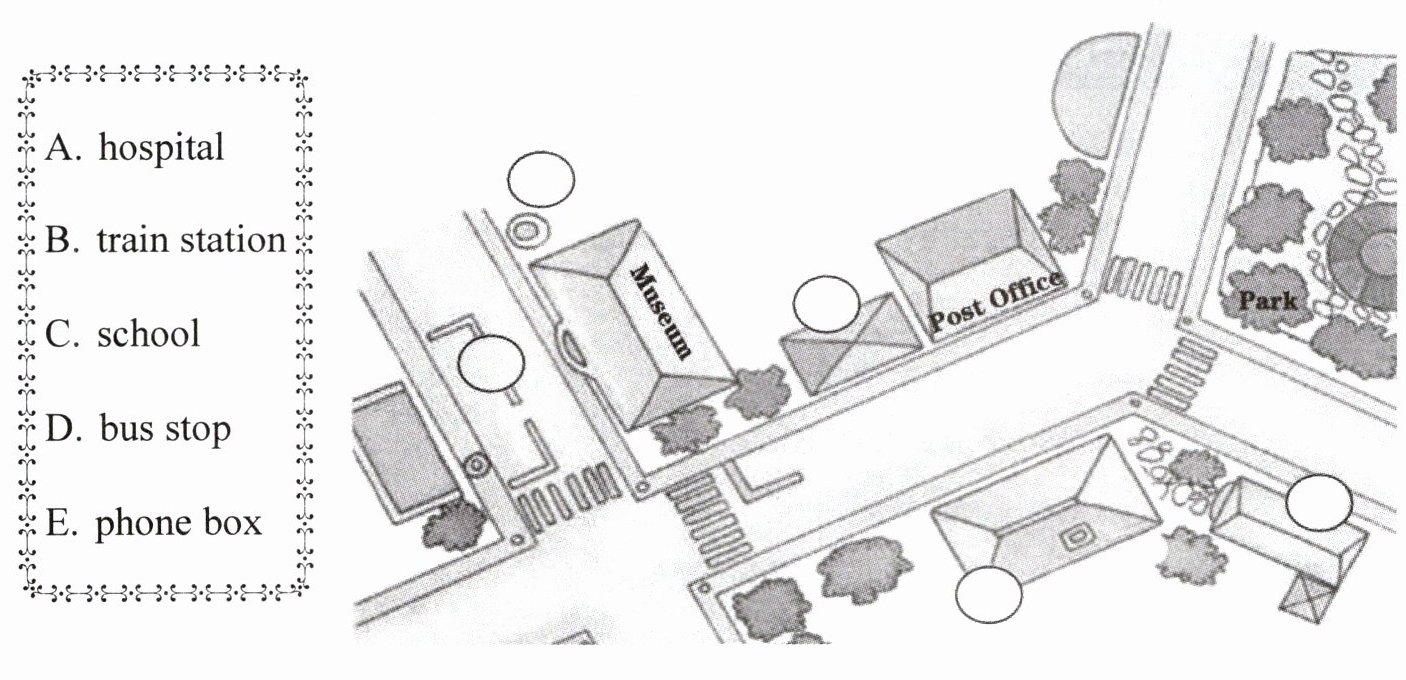 听录音,将方框内地点单词的字母序号写在图中对应的圆圈内。