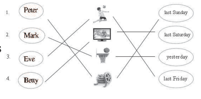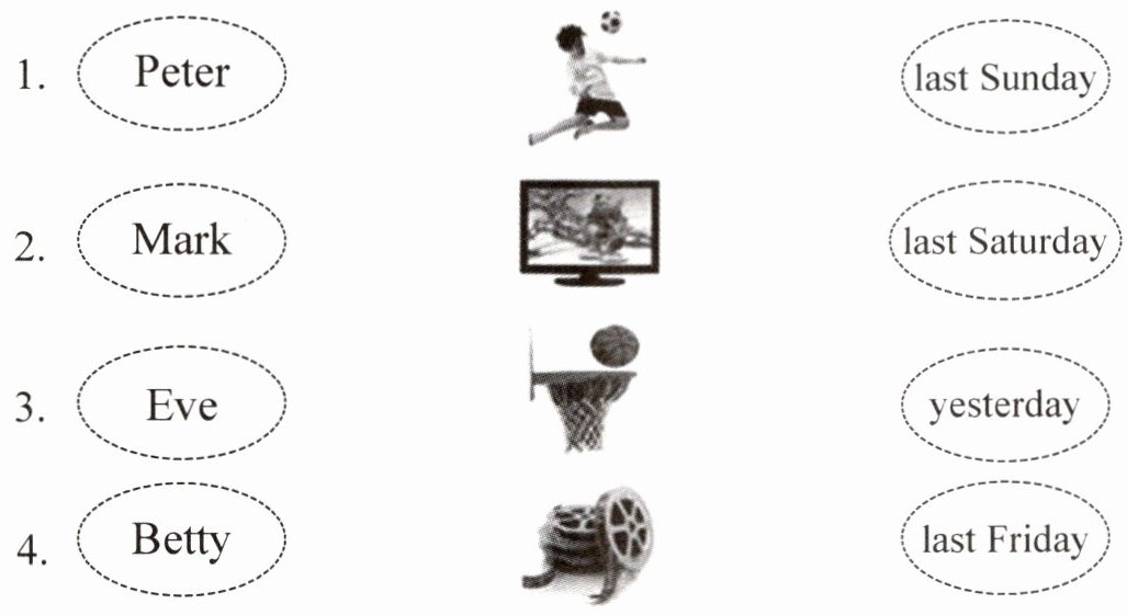 听录音,将人名与对应的图片、时间短语相连,然后在横线上写出正确的句子。
