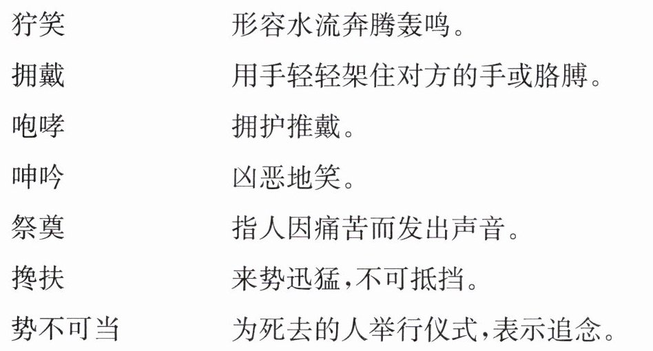 狞笑 凶恶地笑。拥戴 拥护推戴。咆哮 形容水流奔腾轰鸣。呻吟 指人因痛苦而发出声音。祭奠 为死去的人举行仪式,表示追念。搀扶 用手轻轻架住对方的手或胳膊。势不可当 来势迅猛,不可抵挡。