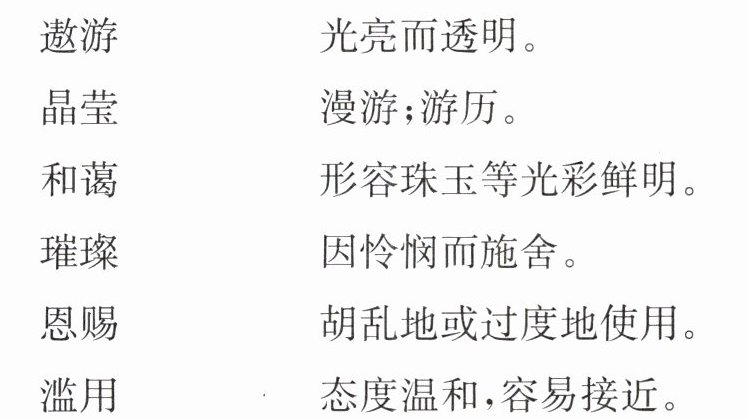遨游—漫游;游历。 晶莹—光亮而透明。 和蔼—态度温和,容易接近。 璀璨—形容珠玉等光彩鲜明。 恩赐—因怜悯而施舍。 滥用—胡乱地或过度地使用。