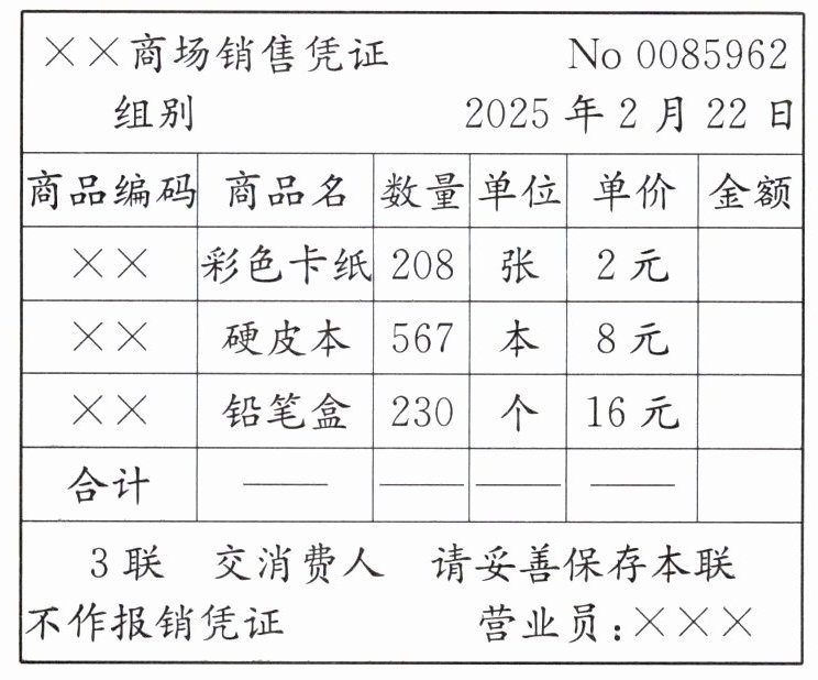 3. 下图是学校购买文具的一张收据,请算出相应的金额。先笔算,再用计算器验算。