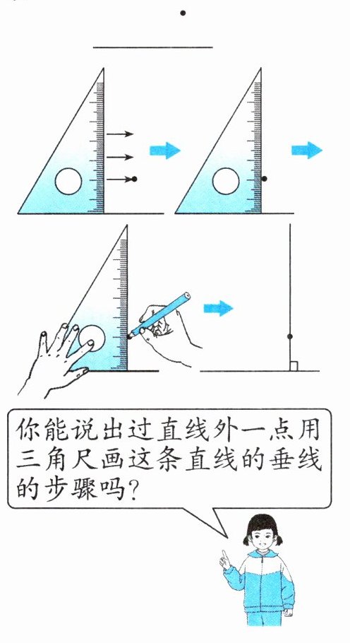 2.过直线外一点,用三角尺画这条直线的垂线的步骤: