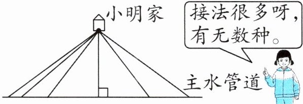 1. 自来水公司的工人叔叔要给新建成的住宅小区各户接引水管。自来水公司的主水管道经过小明家门前,要想用引水管把水接到小明家里来,有多少种接法?哪种接法最省材料?