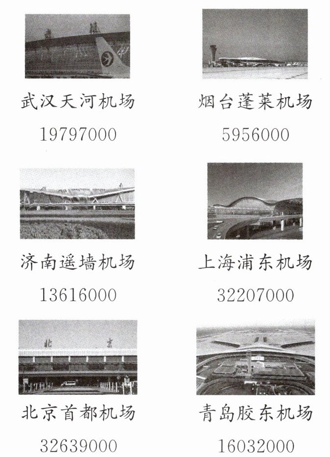 下面是某年我国几个机场的旅客吞吐量(单位:人次)。你能把六个机场的旅客吞吐量从小到大排一排吗?