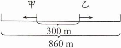 4. 两栋大楼的门口相距300m。甲、乙两人各从其中一栋大楼门口出发,同时向相反的方向走去(如下图),7分钟后两人相距860m。甲每分钟走37m,乙每分钟走多少米?(8分)