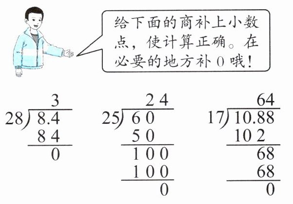 同样按照整数除法法则计算,$60÷25$,$25×2 = 50$,余$10$,补$0$变为$100$,$100÷25 = 4$,因为被除数$60$可看作$60.0$,商的小数点要和被除数$60.0$的小数点对齐,所以商是$2.4$。