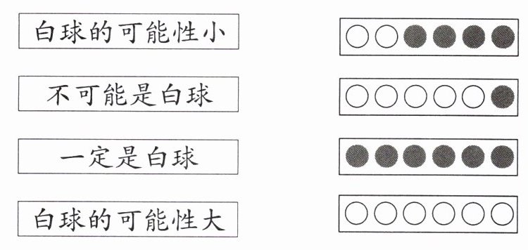 “白球的可能性小”连“$○○●●●●$”;“不可能是白球”连“$●●●●●●$”;“一定是白球”连“$○○○○○○$”;“白球的可能性大”连“$○○○○○●$”。