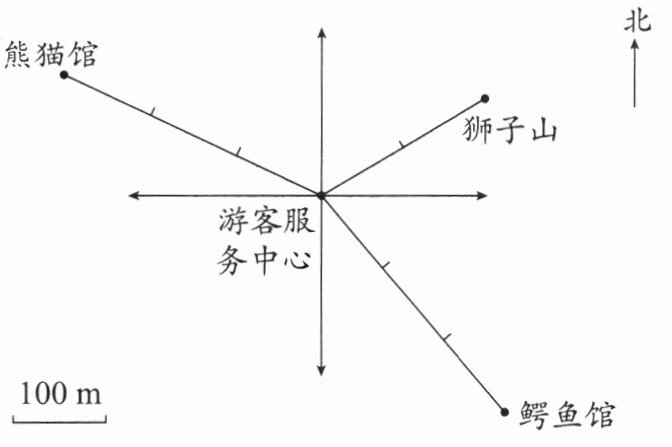 量一量,说一说狮子山、熊猫馆、鳄鱼馆分别在游客服务中心的什么位置。