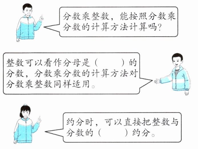 )的分数,分数乘分数的计算方法对分数乘整数同样适用。约分时,可以直接把整数与分数的(