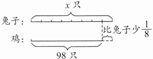 $x-\frac{1}{8}x=98$ $x=112$(或$(1-\frac{1}{8})x=98$ $x=112$)
