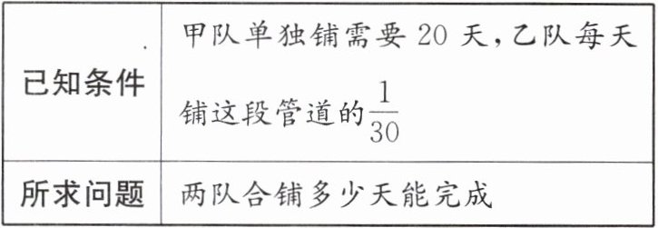 探究:铺一段输油管道,甲队单独铺需要20天,乙队每天铺这段管道的$\frac{1}{30}$。两队合铺多少天能完成?