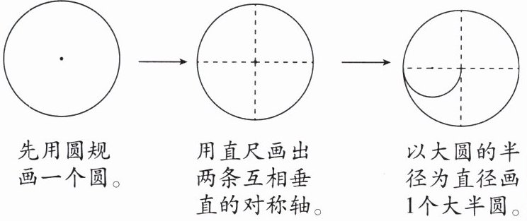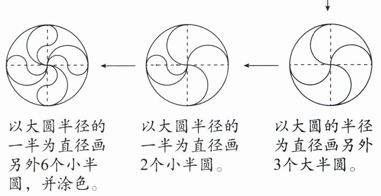 用圆可以设计出许多漂亮的图案。在用直尺和圆规画图前,先要仔细观察图形的特点,想好分哪几步画,再一步一步地画出图形。