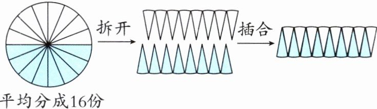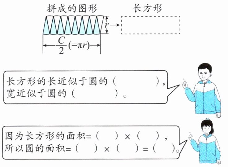 (2)拼成的近似的长方形的长和宽与圆的周长、半径有什么关系?