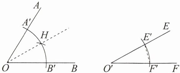 4. 如图,已知$\angle AOB与\angle EO'F$($\angle AOB>\angle EO'F$),分别以点$O$,$O'$为圆心,以同样长为半径作弧,分别交$OA$,$OB于点A'$,$B'$,交$O'E$,$O'F于点E'$,$F'$。以点$B'$为圆心,以$E'F'$为半径作弧,在$\angle AOB的内部交弧A'B'于点H$。下列结论正确的是(