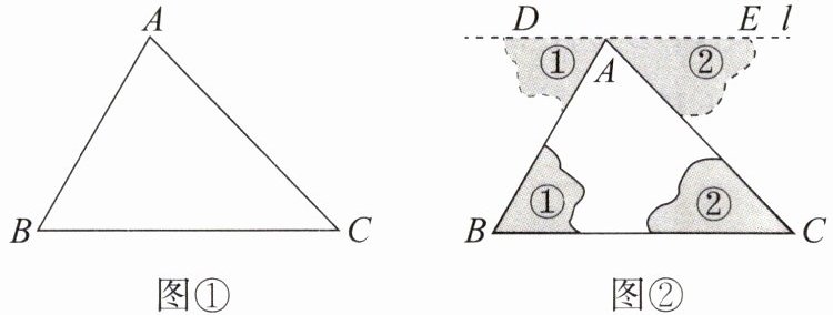 。问题2:如图②,过点A作直线l//BC,请你借助图形证明“三角形的内角和等于180°”。