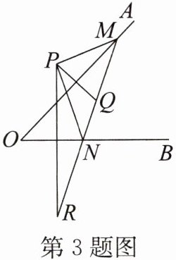3. 如图,点$P是\angle AOB$外的一点,点$M$,$N分别是\angle AOB$两边上的点,点$P关于OA的对称点Q恰好落在线段MN$上,点$P关于OB的对称点R落在MN$的延长线上. 若$PM = 2.5\mathrm{cm}$,$PN = 3\mathrm{cm}$,$MN = 4\mathrm{cm}$,则线段$QR$的长为(