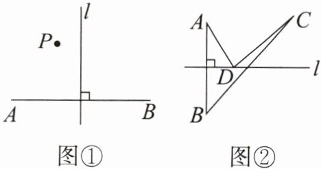 【自主探究】(1)如图①,直线$l是线段AB$的垂直平分线,点$P在直线l$的左侧,经测量,$PA\lt PB$,请证明这个结论.