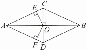 9. 如图,在四边形$ADBC$中,$AB与CD$互相垂直平分,垂足为$O$. 若$OE$,$OF分别是点O到\angle CAD$两边的距离,试说明它们之间的大小关系.