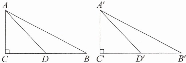 证明:在Rt△ACD和Rt△A'C'D'中,$\begin{cases}AD=A'D',\\AC=A'C',\end{cases}$所以Rt△ACD≌Rt△A'C'D'(HL)。所以CD=C'D'。因为AD与A'D'分别为BC,B'C'边上的中线,所以CB=C'B'。在Rt△ABC和Rt△A'B'C'中,$\begin{cases}AC=A'C',\\∠C=∠C'=90°,\\CB=C'B',\end{cases}$所以Rt△ABC≌Rt△A'B'C'(SAS)。