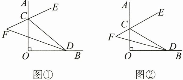 (2)当$C$,$D$在射线$OA$,$OB$上任意移动时(不与点$O$重合)(如图②),$∠F$的大小是否变化?请说明理由.