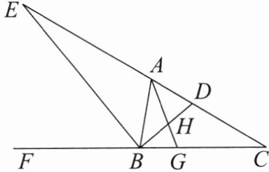 5. 如图,在$\triangle ABC$中,$∠ABC的平分线交AC于点D$,作$∠BAG= ∠C$,外角$∠ABF的平分线交CA的延长线于点E$。