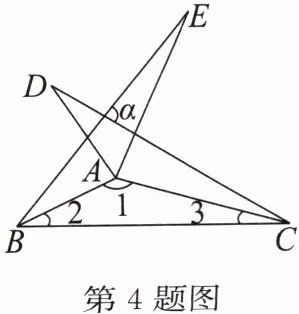 4. 如图,$\triangle ABE和\triangle ADC是\triangle ABC分别沿着AB$,$AC$翻折形成的,若$\angle 1:\angle 2:\angle 3 = 28:5:3$,则$\angle \alpha$的度数是