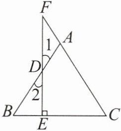 ∠1;在△ABC中,因为AB=AC,所以∠B=∠C(等边对等角).因为DE⊥BC,所以∠DEB=∠DEC=90°(垂直的定义).所以∠2+∠B=90°,∠F+∠C=90°.所以∠2=∠F(等角的余角相等).又因为∠1=∠2(对顶角相等),所以∠1=∠F.所以AF=AD(等角对等边).所以△ADF是等腰三角形.