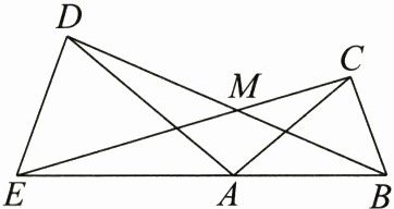 20. (10 分) 如图,在 $ \triangle ABC $ 和 $ \triangle AED $ 中, $ AB = AC $, $ AE = AD $, $ \angle BAC = \angle EAD $,且点 $ E $, $ A $, $ B $ 在同一条直线上,点 $ C $, $ D $ 在 $ EB $ 的同侧,连接 $ BD $, $ CE $ 交于点 $ M $.