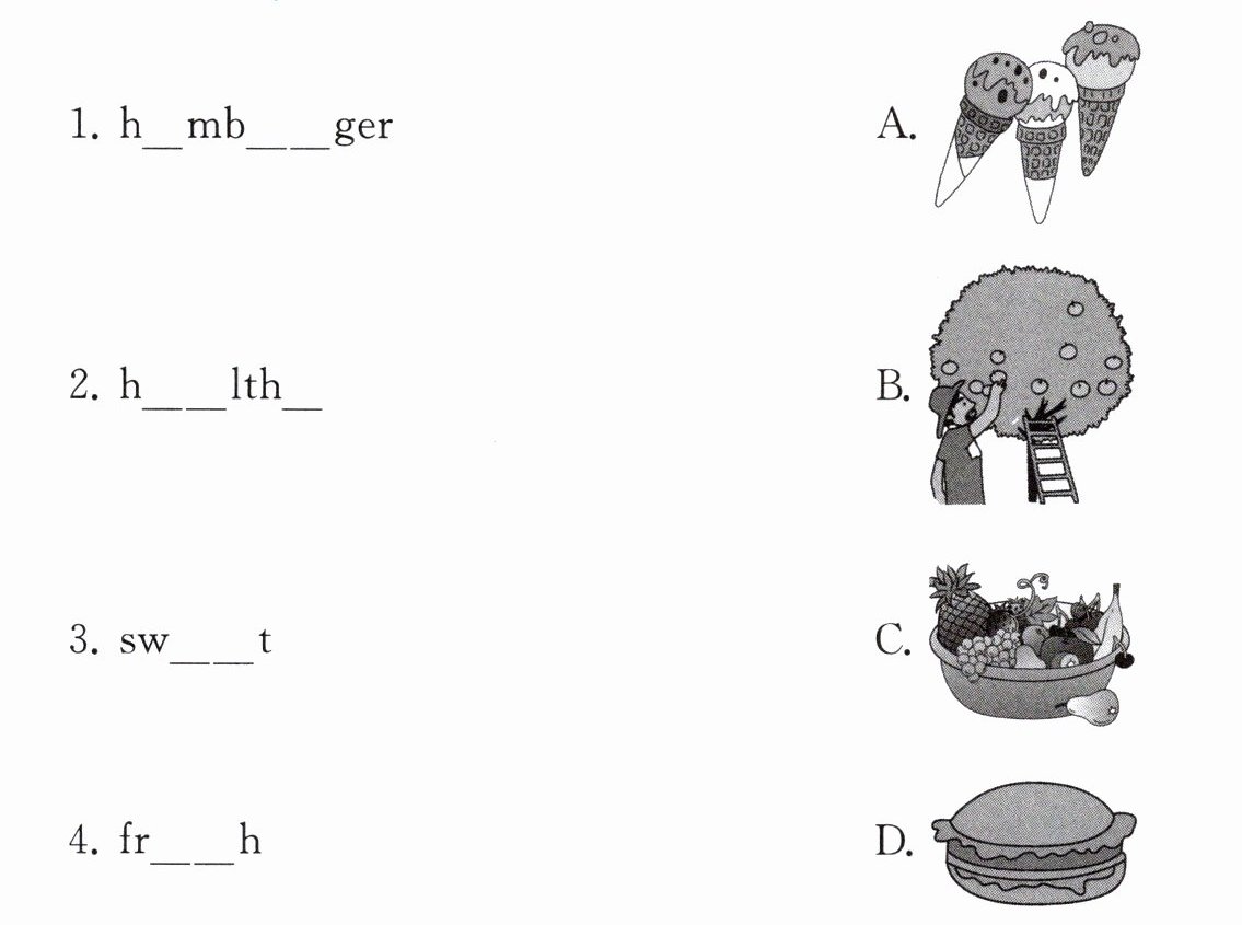1. hamburger—D 2. healthy—C 3. sweet—A 4. fresh—B