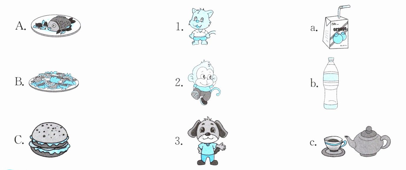 三、读一读,将下列动物与他们点的食物或饮料连线。